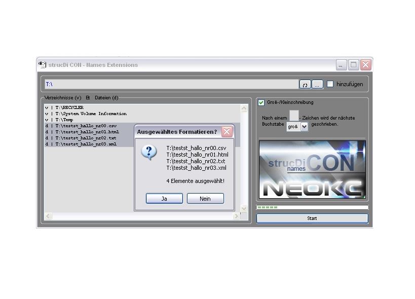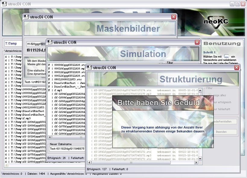 Mit strucDi CON lässt sich der Inhalt eines oder mehrerer Verzeichnisse strukturieren. Der Benutzer erstellt auf der Übersichtlichen Oberfläche eine Maske mit dem im Programm integrierten Maskenbildner und kann anschließend alle selektierten Objekte (Dateien und/oder Verzeichnisse) umbenennen lassen. Die erstellte Maske gibt den Dateinamen der strukturierten Dateien an. So lassen sich das aktuelle Datum, mehrere dynamische Zähler, sowie auch Teile des originalen Dateinamens verwenden. Mit strucDi CON bieten wir ein Werkzeug zur schnellen und effektiven Umbenennung eines digitalisierten Musikalbums oder einer riesigen Wallpaper Galerie an.