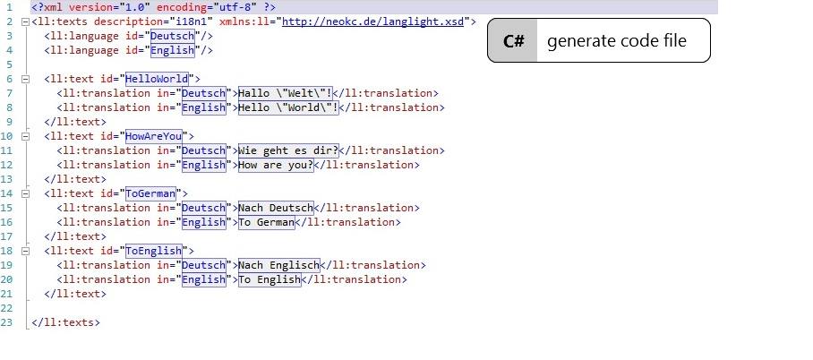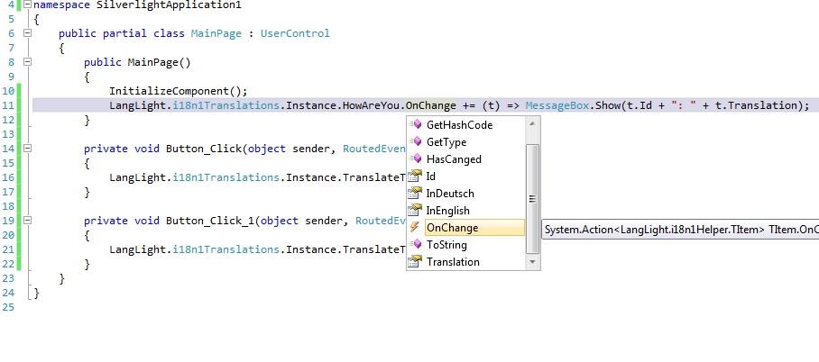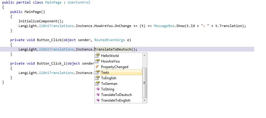 Mit dieser Visual Studio 2010-Erweiterung kann die Internationalisierung einer .NET-Anwendung auf sehr einfache Weise vorgenommen werden. Nach dem Hinzufügen eines “LangLight Translation”-Items können in einer XML DSL (Domain Specific Language) Texte und deren Übersetzungen in beliebigen Sprachen definiert werden. Aus dieser LangLight DSL kann anschließend eine C#-Klasse generiert werden. Objekte können dann an Übersetzungen der Texte binden und werden somit automatisch geändert, wenn die aktuelle Sprache zur Laufzeit geändert wird. Übersetzungen können auch zur Laufzeit erstellt, angepasst und ausgeschlossen werden. LangLight benötigt keine Resource-Dateien und bleibt daher sehr leichtgewichtig und flexibel.