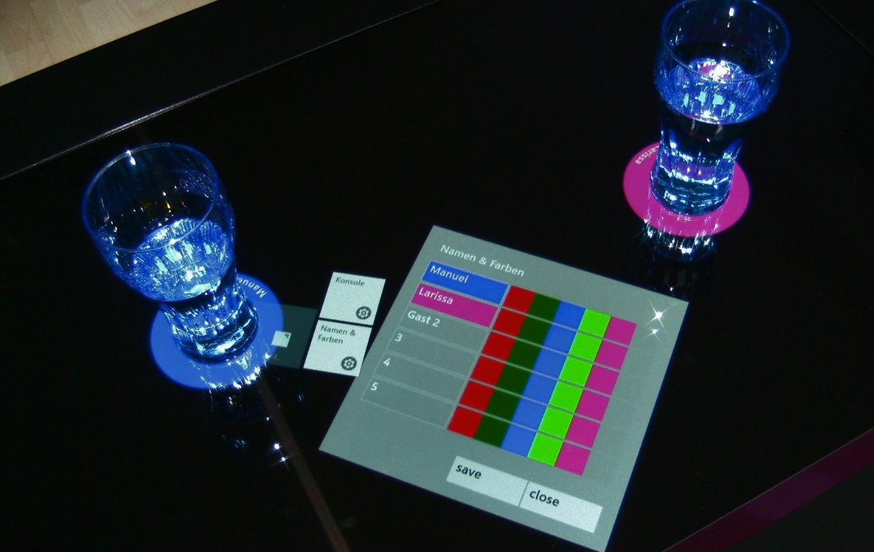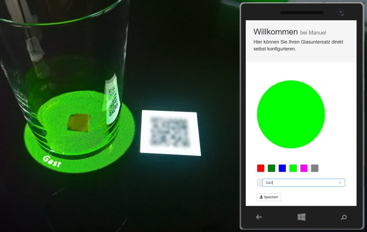 Neben jedem Glasuntersatz wird ein QR-Code angezeigt. Der Glasbesitzer kann diesen mit seinem Smartphone scannen und dann direkt Name und Farbe einstellen. Dazu brauch er nicht im selben WLAN sein oder vorher eine App installieren. Zusätzlich können Namen und Farben auch über das Glas des Gastgebers interaktiv verändert werden. Es werden bis zu sechs verschiedene Glasuntersätze unterstützt, die anhand der PixelSense Byte Tags unterschieden werden.