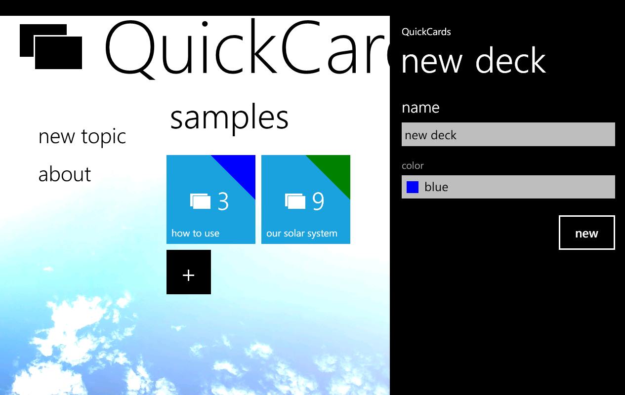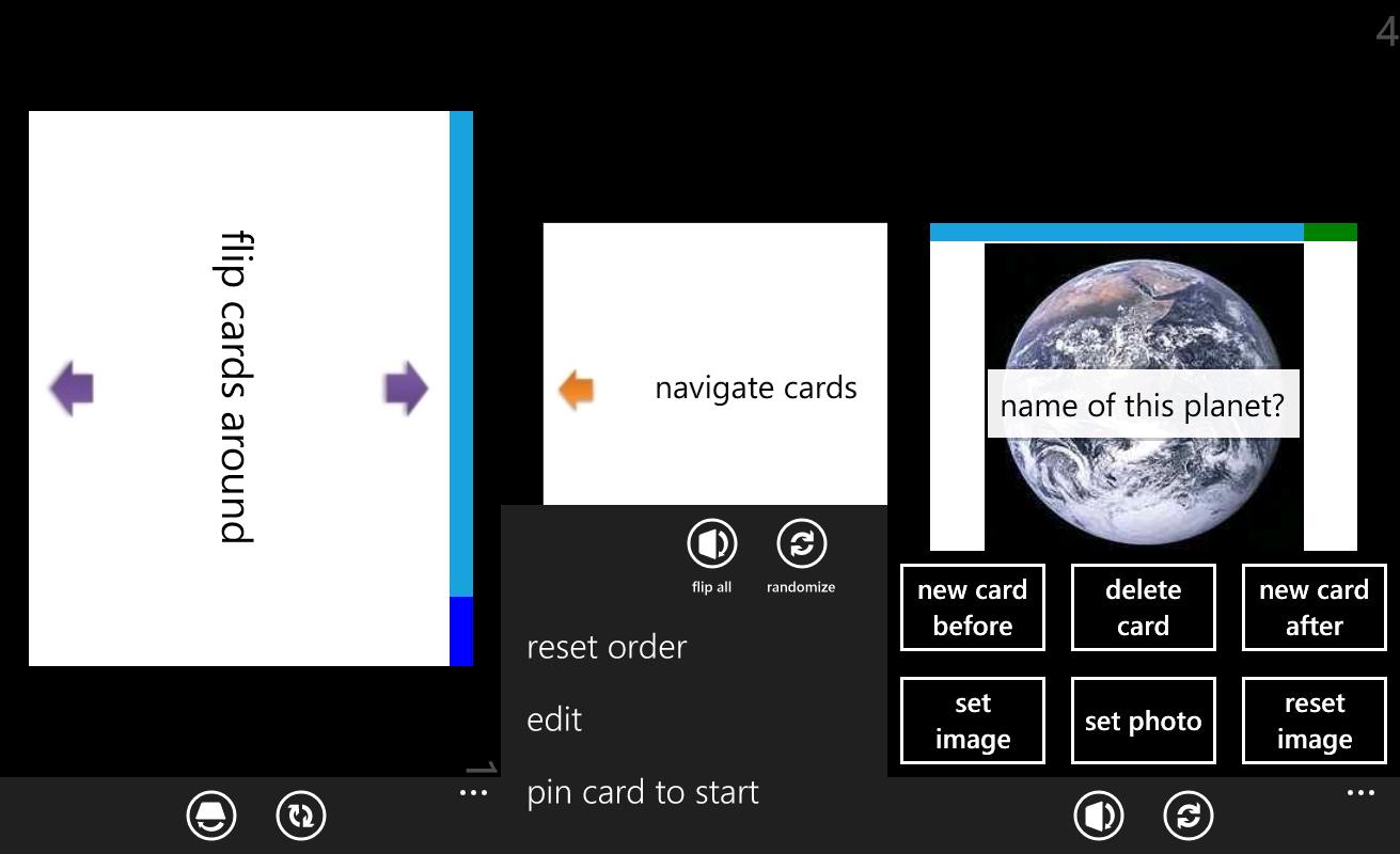 Diese App ist ein leichtgewichtiger Flashcard Manager, der alle Arten des Karteikarten-basierten Lernen unterstützt. Die Karten werden in Decks organisiert, die wiederum in Topics organisiert werden. Jede Karte besitzt eine Vorder- und Rückseite und kann mit einer intuitiven Geste umgedreht werden. Bilder und Texte können auf beiden Kartenseiten plaziert werden. Bilder können dabei aus der Bibliothek des WindowsPhones ausgewählt oder direkt mit der Kamera fotografiert werden.